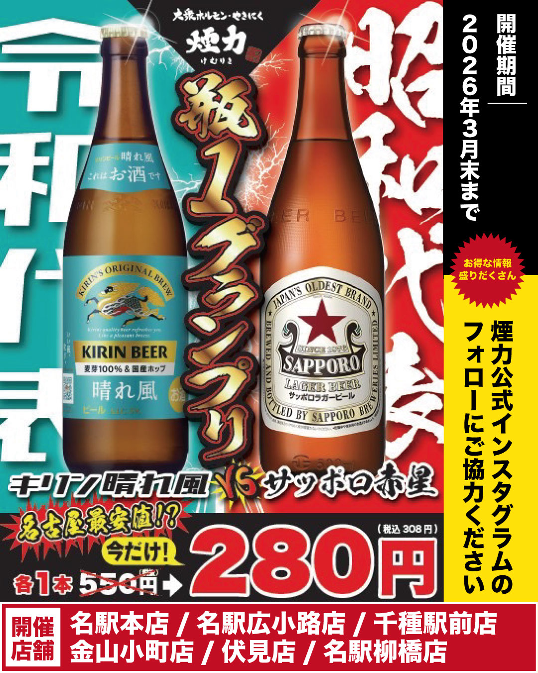 名古屋最安値に挑戦!瓶ビール280円!? 2026.03.03 2025.11.15 開催店舗一覧 煙力 名駅本店 2022.12.022025.11.15 煙力 名駅広小路店 2022.12.022025.12.26 煙力 千種駅前店 2022.12.022025.11.15 煙力 金山小町店 2022.12.022025.11.15 煙力 伏見店 2022.12.022025.11.15 煙力名駅柳橋店 2022.12.022025.12.01